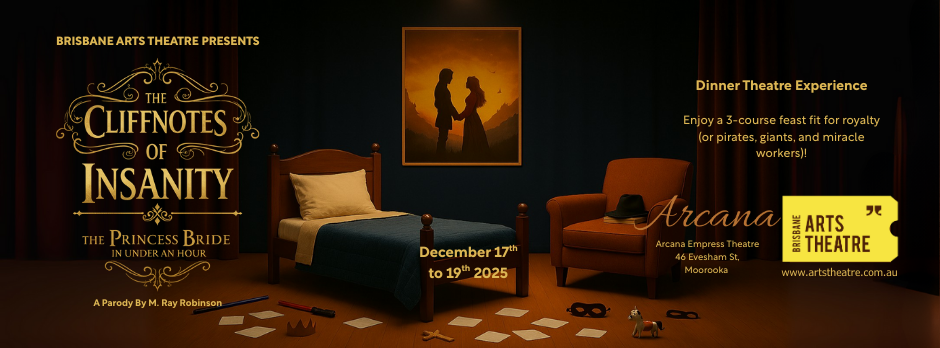 17 December 2025 7:00 pm – 10:00 pm Arcana Brisbane, 46 Evesham Street, Moorooka QLD 4105 The Cliffnotes of Insanity– The Princess Bride in under an hourBy M. Ray Robinson Dinner Theatre ExperienceYour ticket includes an evening of frivolity and madness: “Have fun storming the castle!”Don’t miss this unforgettable night of laughter, love, and lunacy!